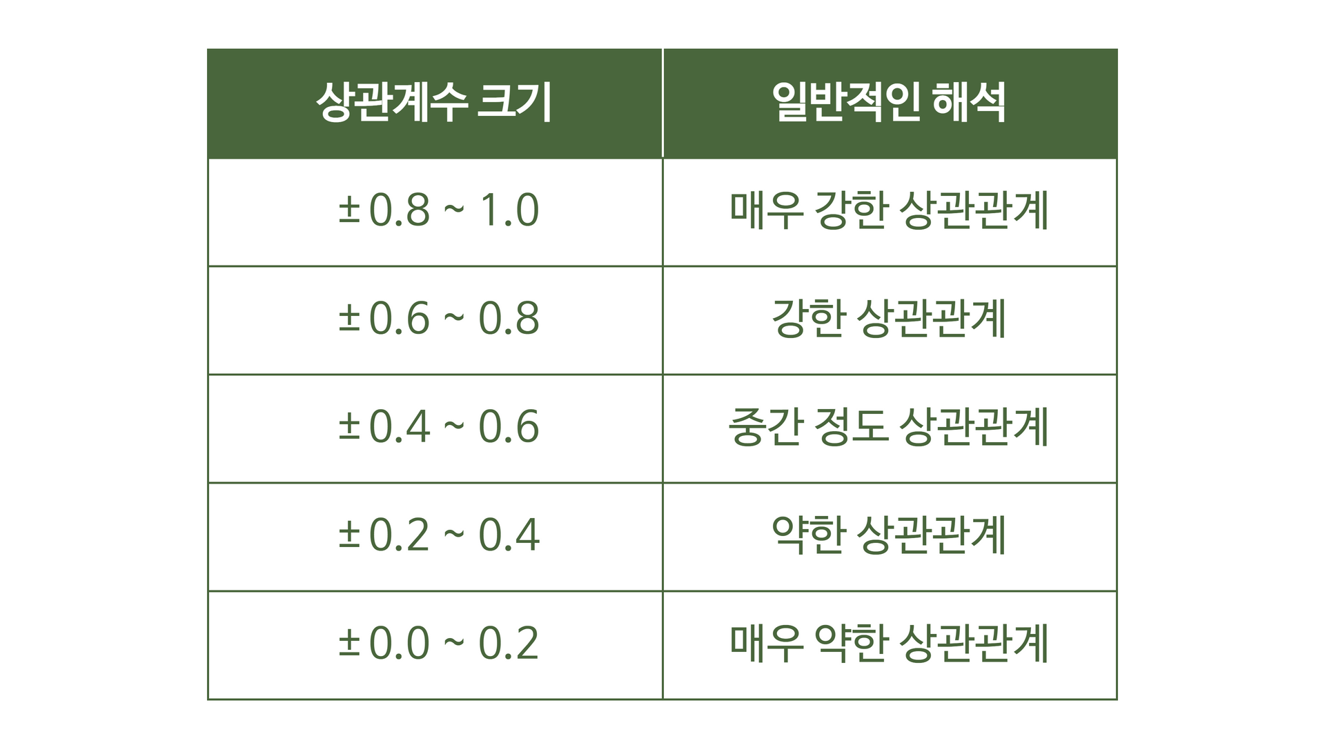 - 1에 가까울수록 두 변수는 양의 선형 관계를 갖습니다.